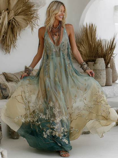 Women's Vintage Cherry Blossom And Marble Design Sleeveless Dress
