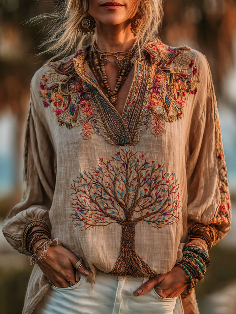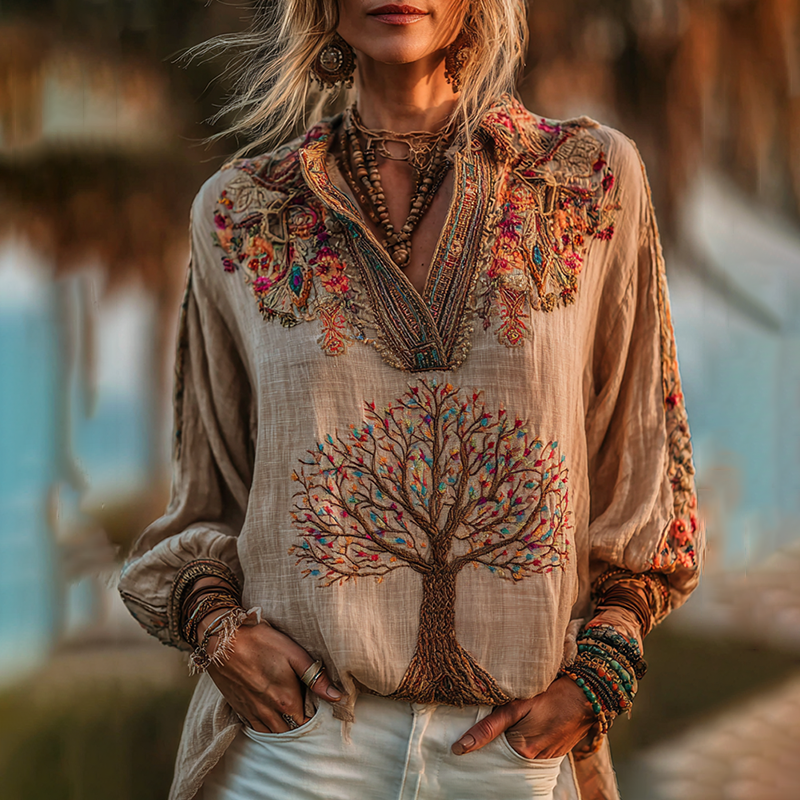 Women's Vintage Viking Tree Of Life Embroidered Lapel Shirt