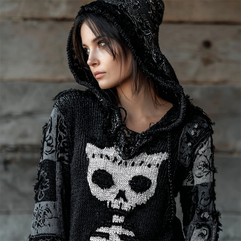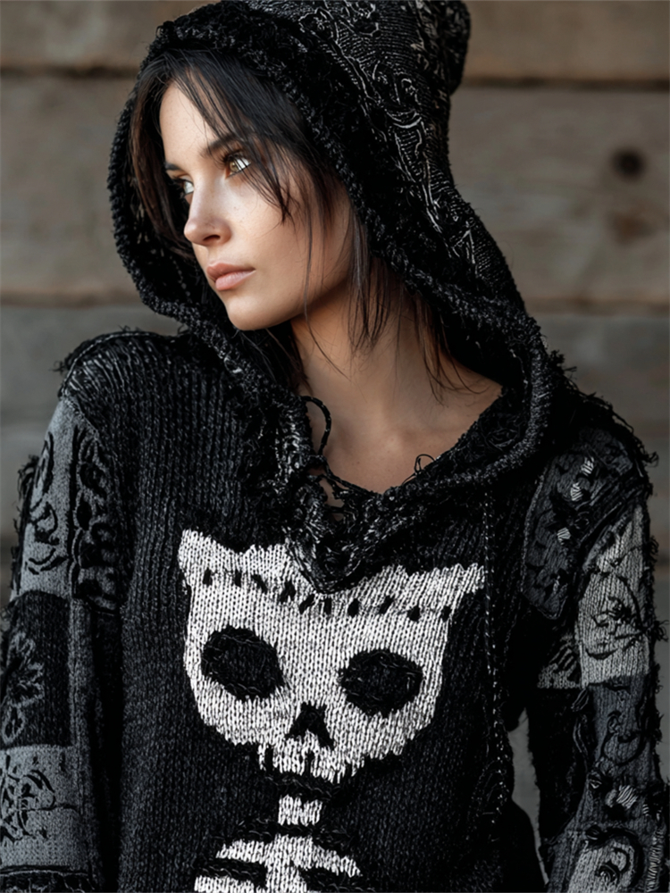 Women's Retro Skeleton Floral Art Knit Hooded Sweater