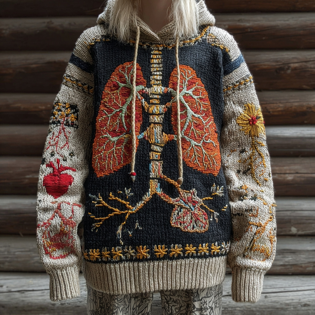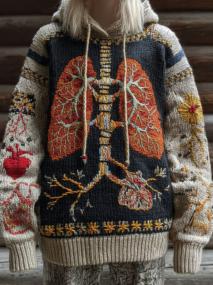 Vintage Halloween Anatomy With Floral Patchwork Art Chunky Knitted Hooded Sweater
