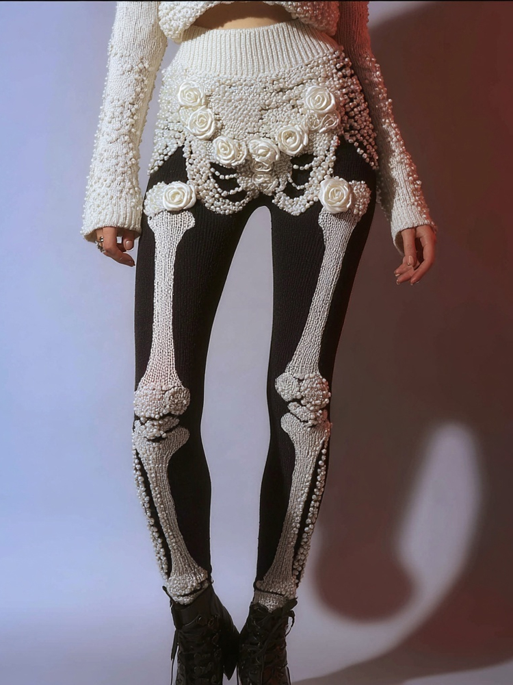 Vintage Skeleton Roses Contrast Color Cozy Knit Leggings