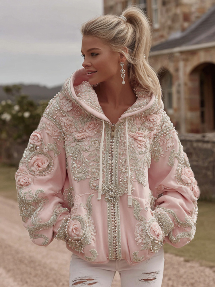 Women's Vintage Pink Floral Embroidery Art Casual Zip Pu Hoodie