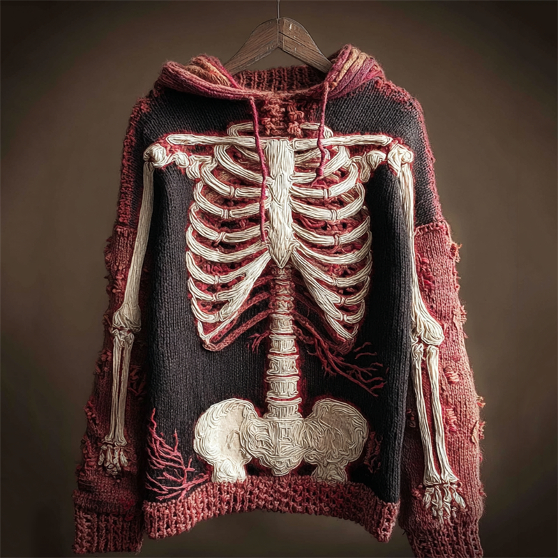 Halloween Skeleton Anatomy Patchwork Hooded Cozy Knit Sweater