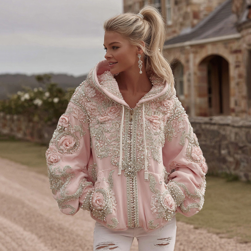 Women's Pink Floral Embroidery Art Casual Hoodie