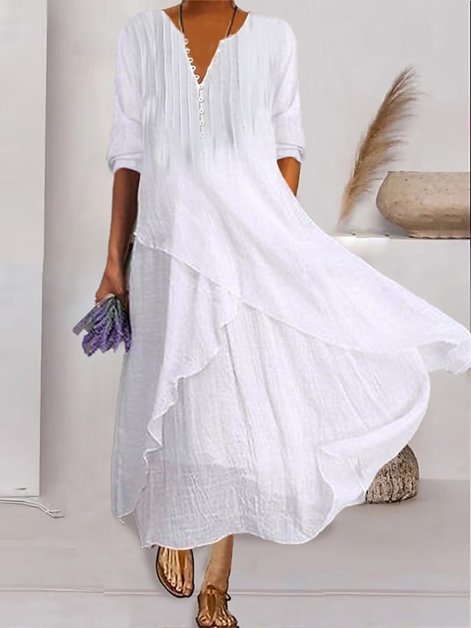 Women's Casual Double Layer Colorblock Multi-Button Design V-Neck Mid-Sleeve Dress