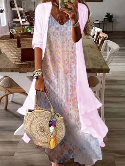 Women's Casual V-Neck Loose Printed Long-Sleeved Two-Piece Dress