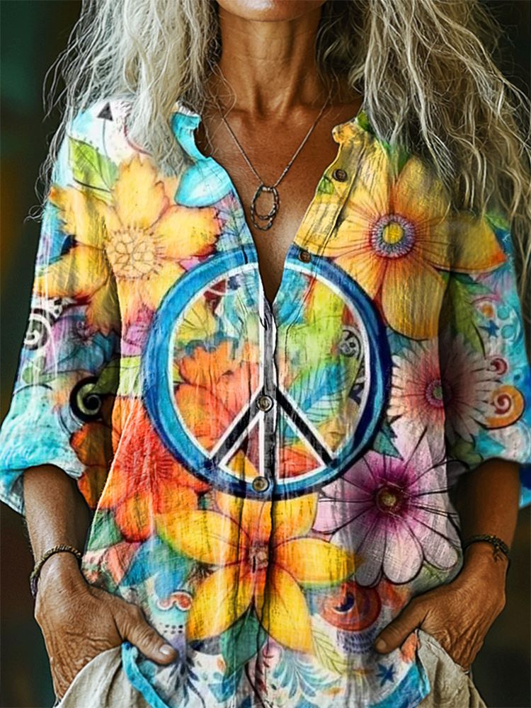 Women's Floral Hippie Pattern Art Print Linen Cotton Casual Shirt