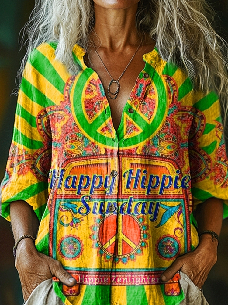 Women's Happy Hippie Sunday Pattern Art Print Linen Cotton Casual Shirt