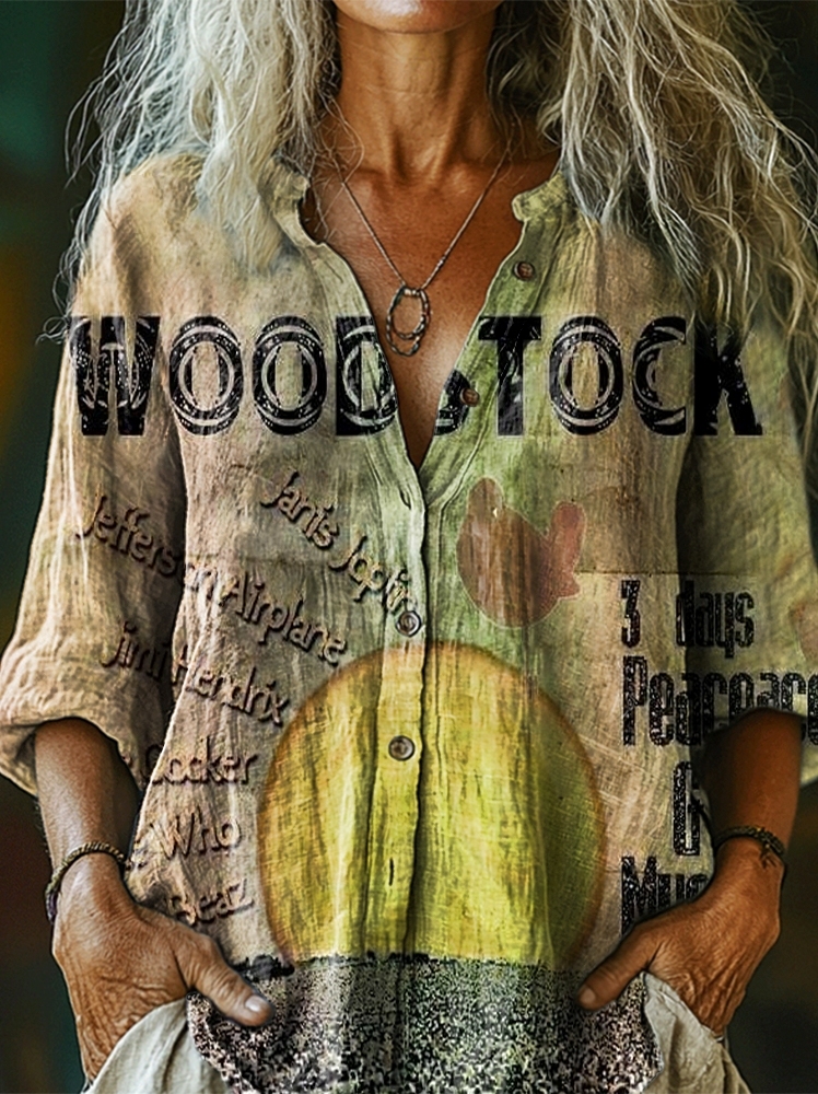 Women's Hippie Woodstock 1969 Art Print Casual Cotton Linen Shirt