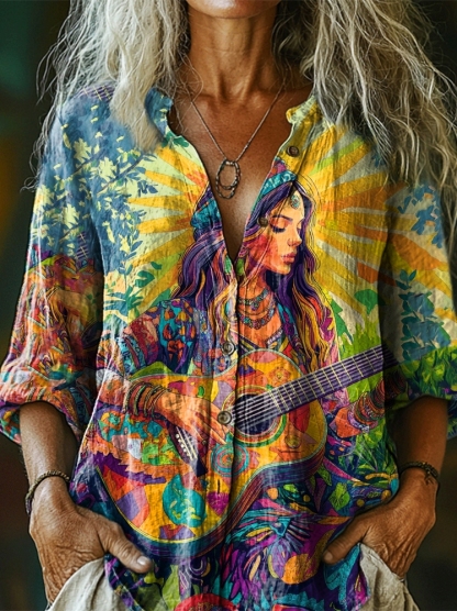 Women's Retro Hippie Music Art Print Casual Cotton Linen Shirt
