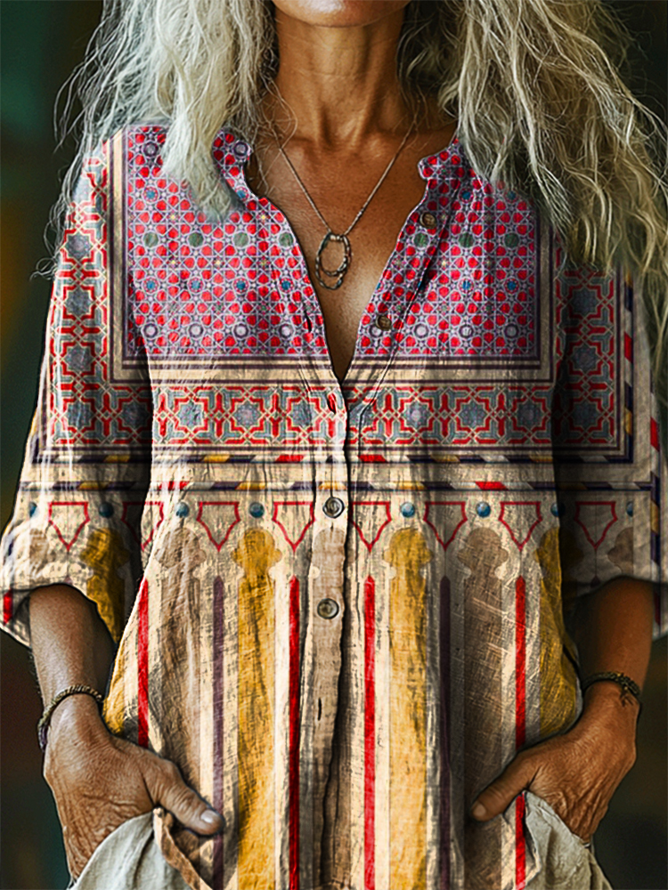 Women's Vintage Ethnic Floral Art Print Casual Cotton Linen Shirt