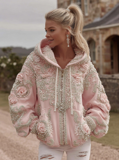 Women's Vintage Roses Embroidery Art Zip Up Hoodie