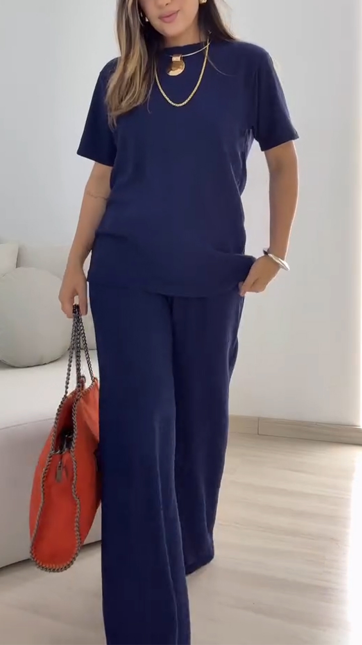 This set showcases a rich navy blue hue that exudes timeless elegance. The short - sleeved top features a classic crew neckline, offering a laid - back yet polished look, while the matching wide - leg pants, with their flowing silhouette and convenient pockets, provide both comfort and a fashion - forward vibe. It’s like a sophisticated upgrade to your loungewear collection, perfect for work - from - home days, casual outings, or any occasion where you want to look effortlessly put - together without sacrificing comfort.
