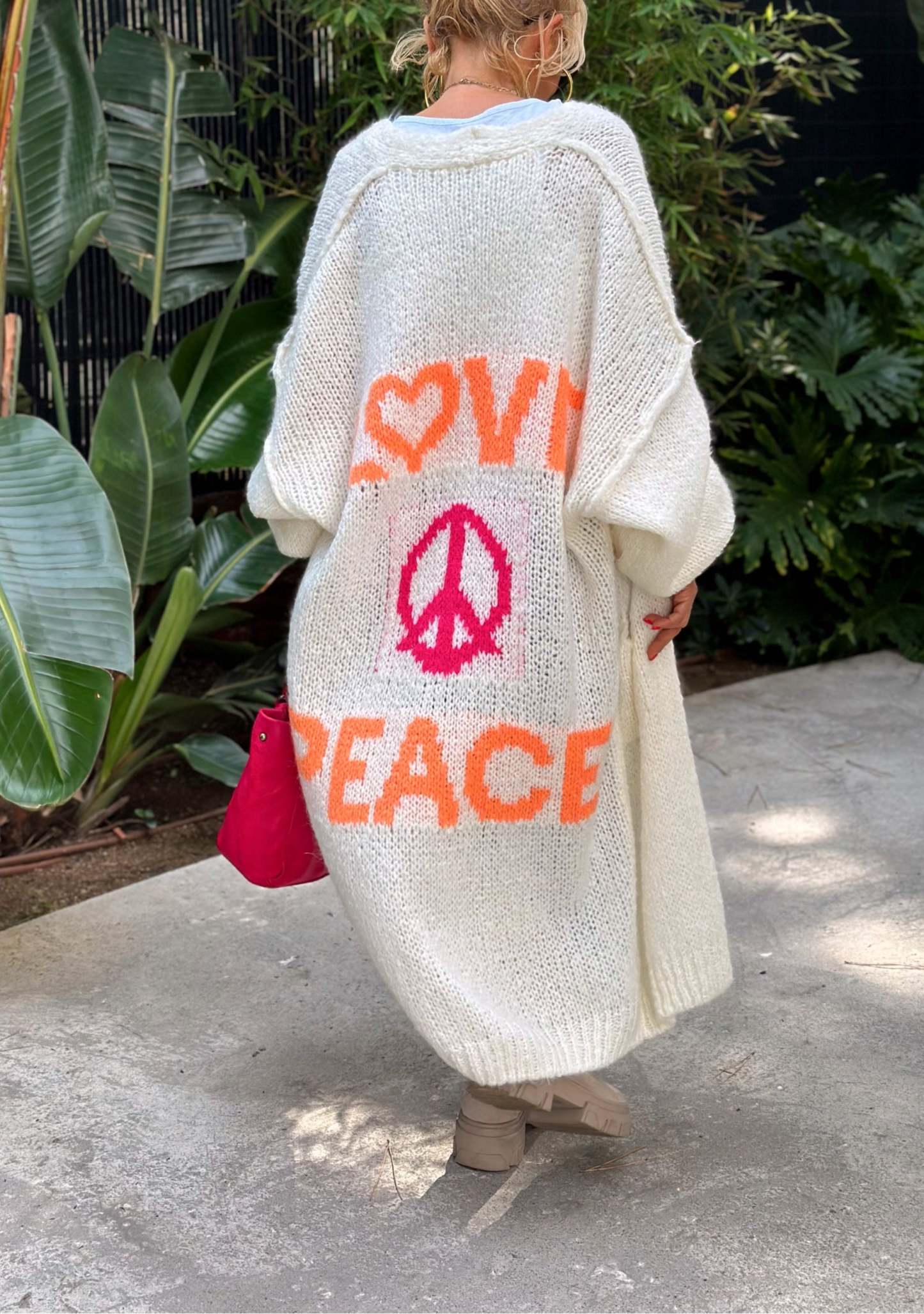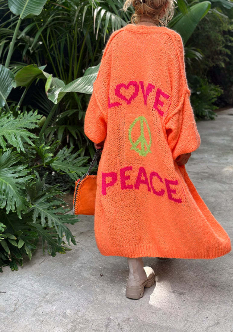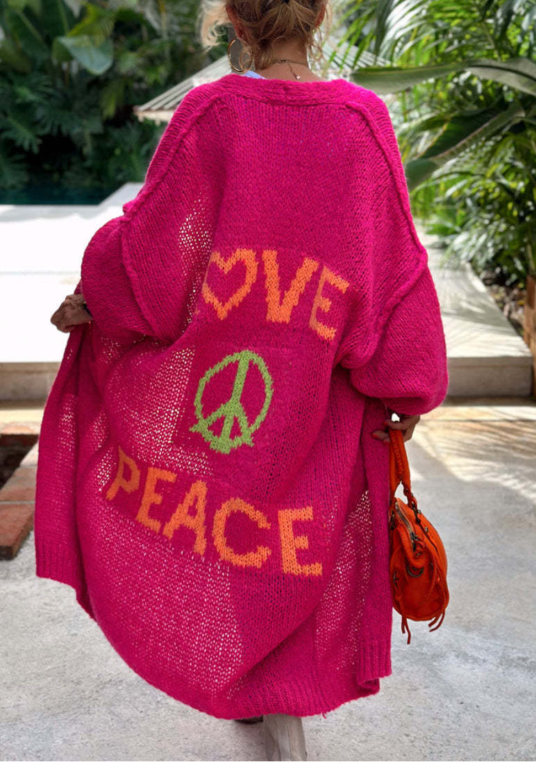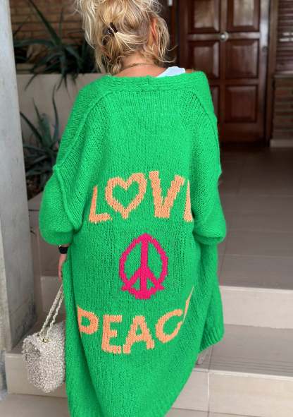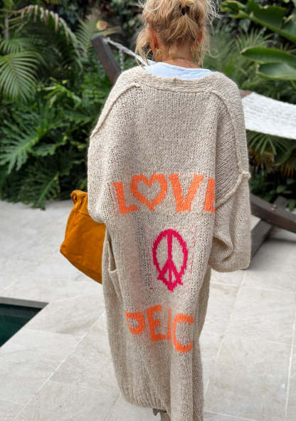 Whether you're a devoted Peace or simply appreciate comfy stylish clothing our Peace Long Knit Cardigan is a must-have. It's more than just clothing; it's a statement piece that mirrors your easygoing personality and an eye for life's finer details.