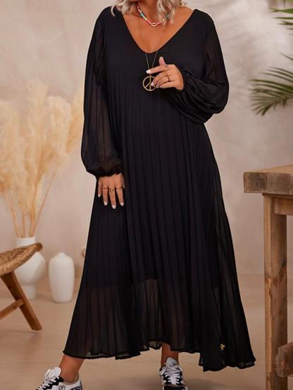 Pleated V-neck Long-sleeved Chiffon Maxi Dress