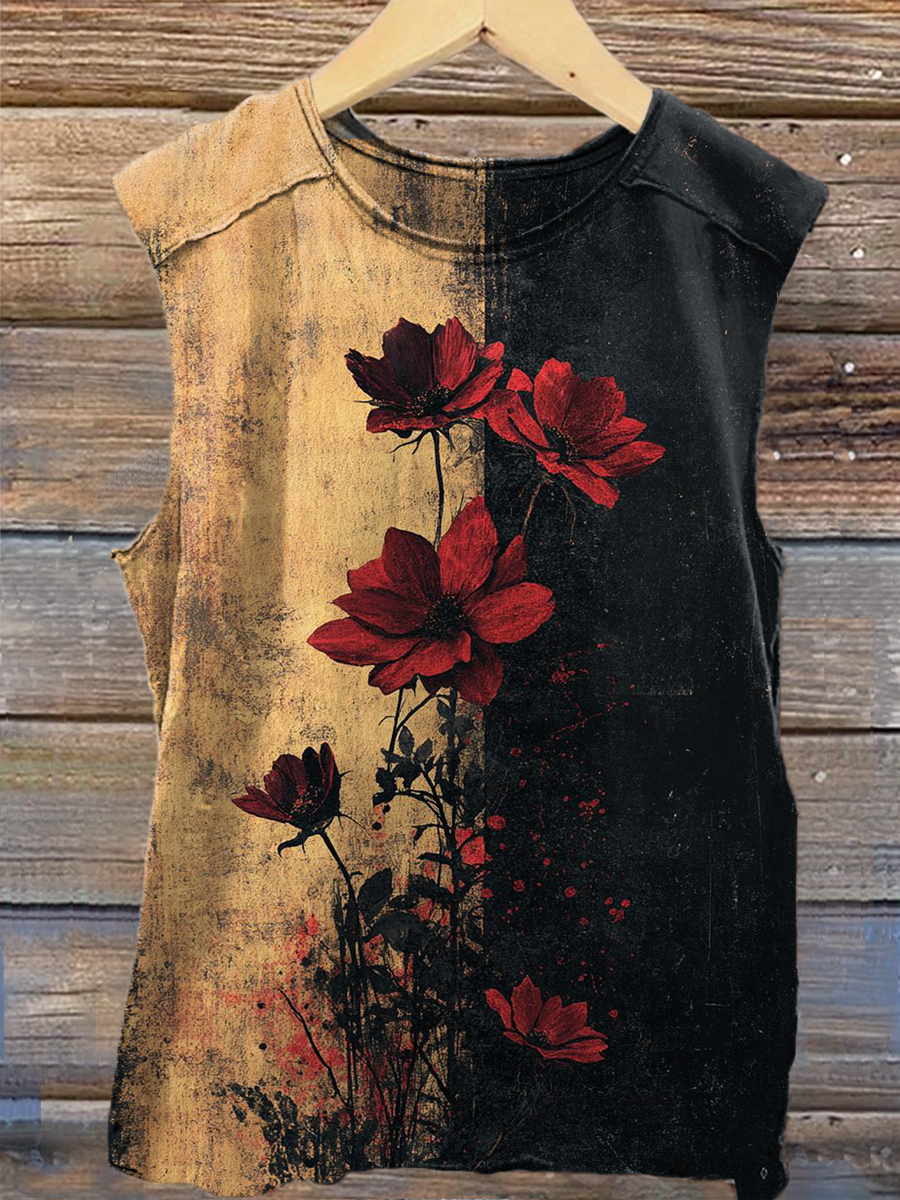 Retro Rose Flower Art Print 100% Cotton Casual Tank Top