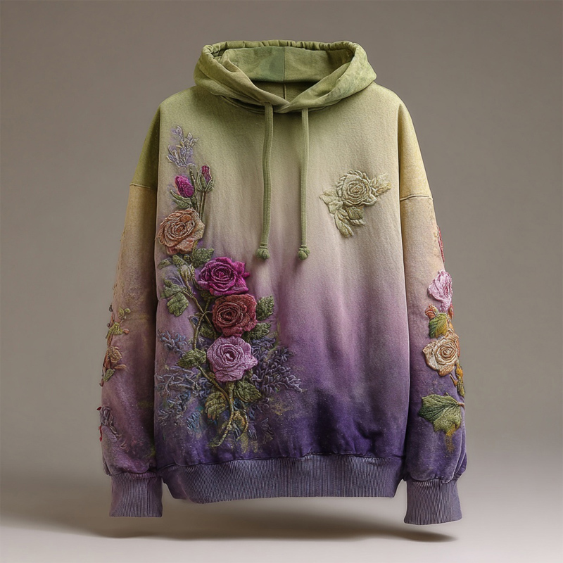 Vintage Roses Embroidered Purple Gradient Comfy Hoodie
