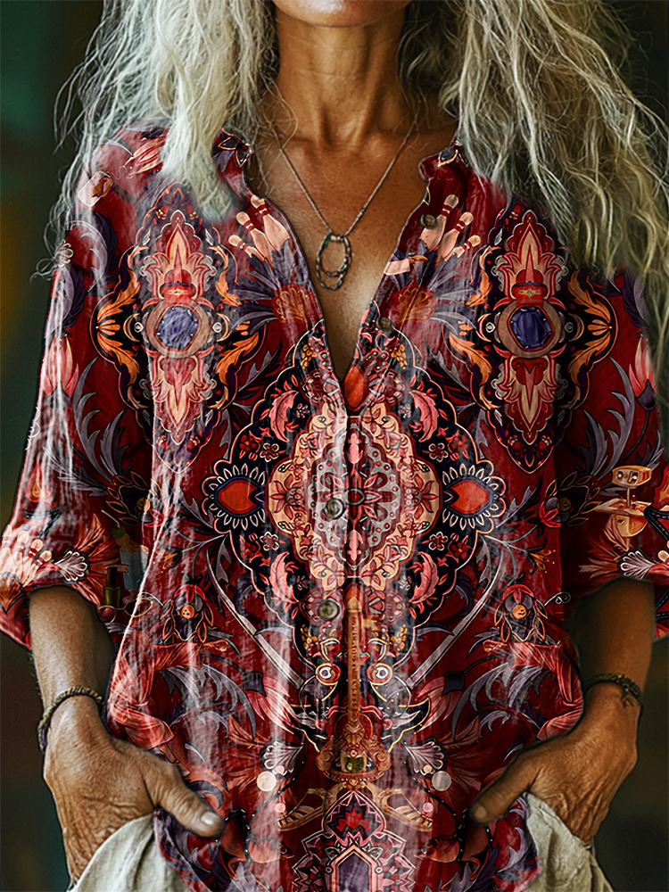 Women's Ethnic Totem Art Patterns Print Linen And Cotton V-neck Casual Shirt