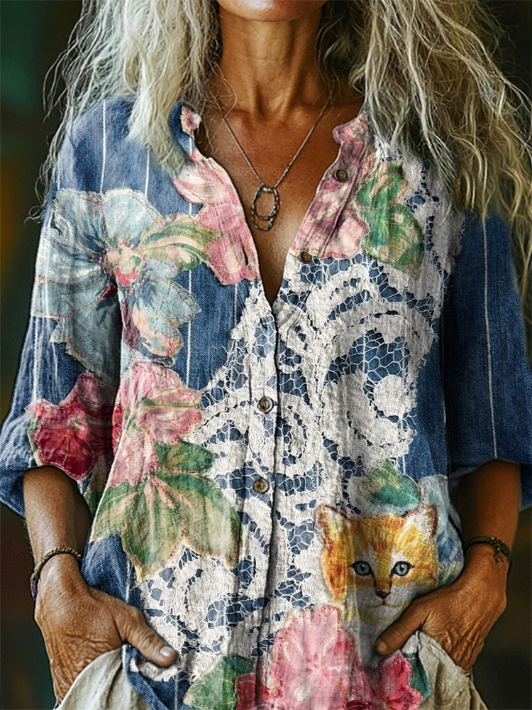 Women's Floral Lace Cat Pattern Art Print Casual Cotton Linen Shirt