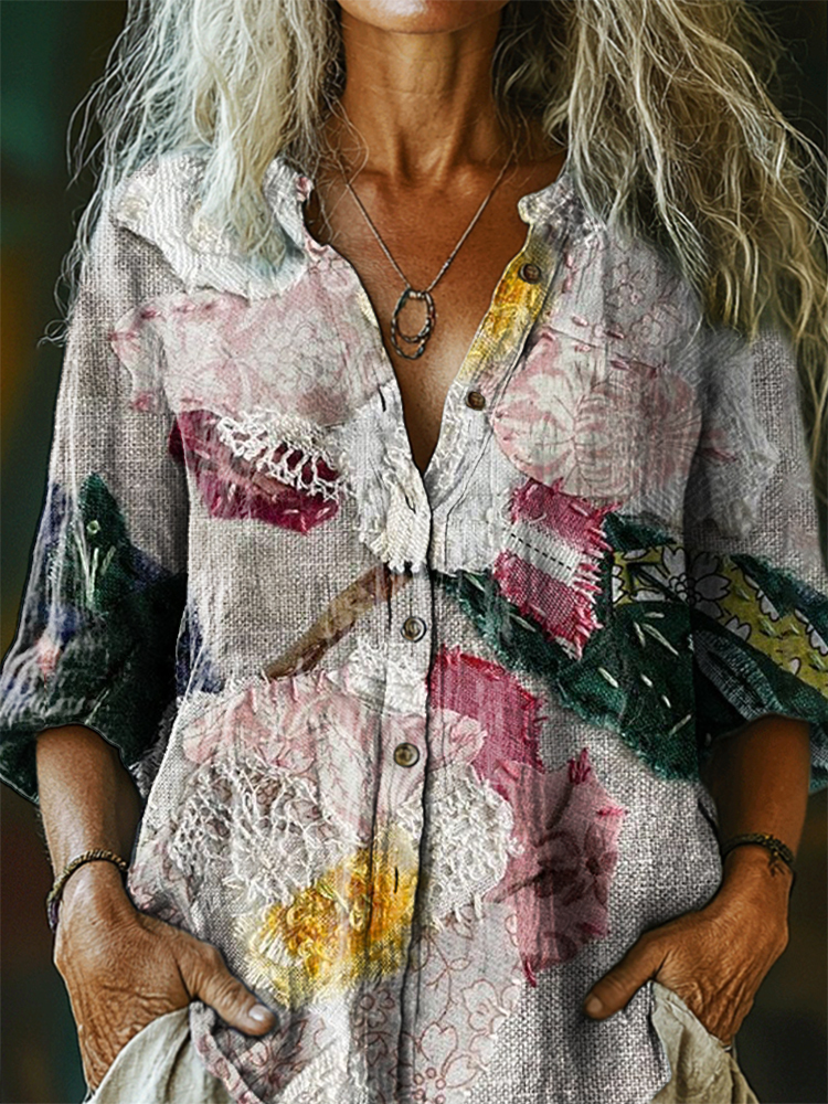 Women's Lace Floral Pattern Art Print Casual Cotton Linen Shirt