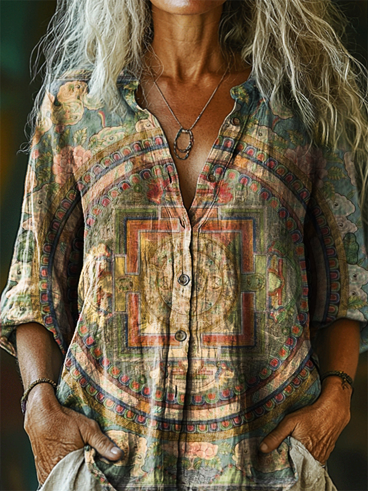 Women's Vintage Ethnic Floral Art Print Casual Cotton Linen Shirt