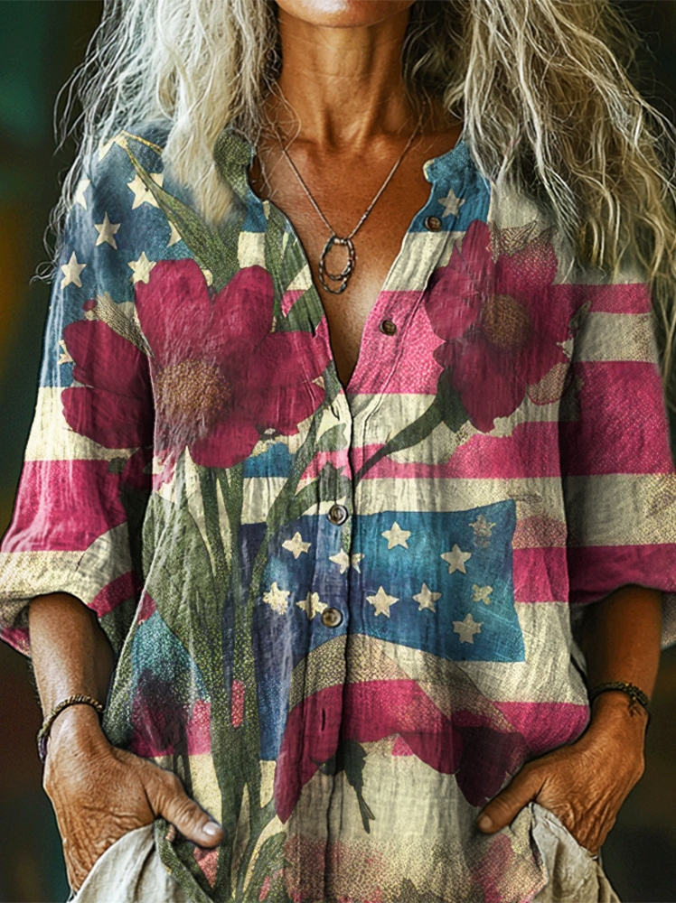 Women's Vintage Flag Floral Art Print Casual Cotton Linen Shirt