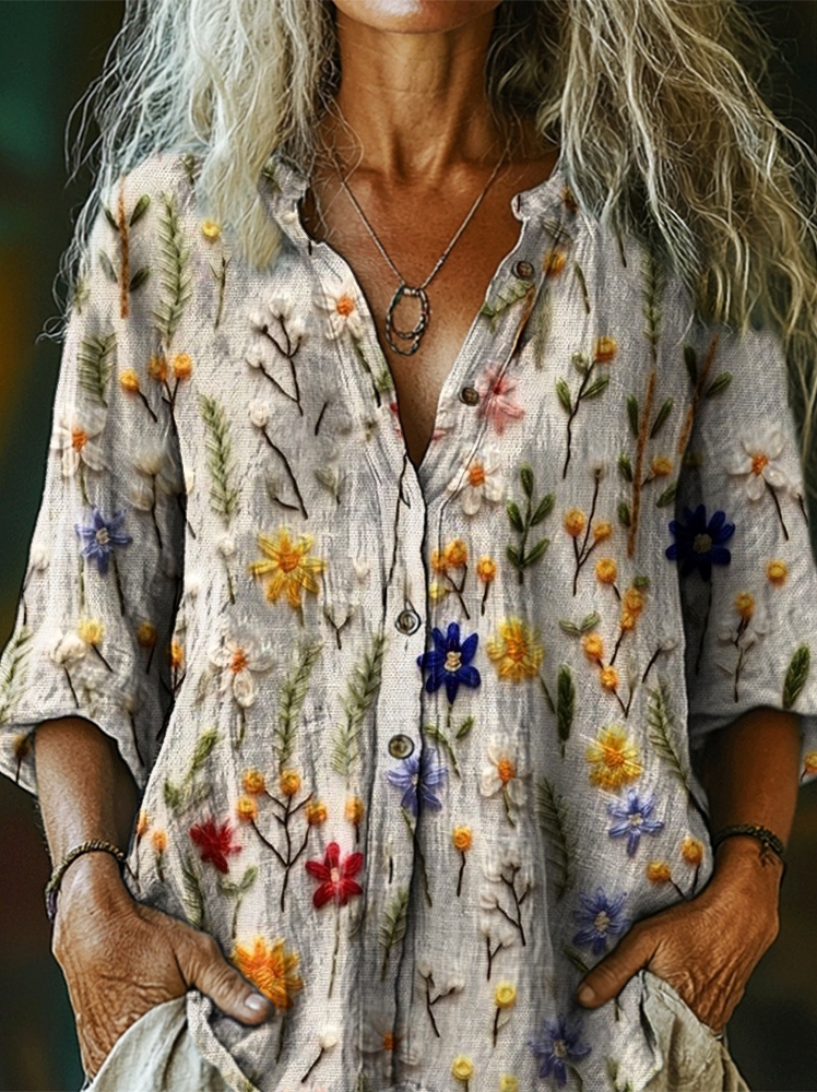 Women's Vintage Floral Art Pattern Print Casual Cotton Linen Shirt