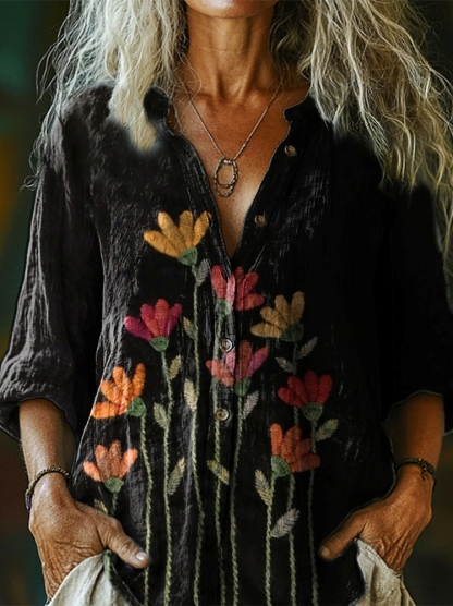 Women's Vintage Floral Art Print Casual Cotton Linen Shirt