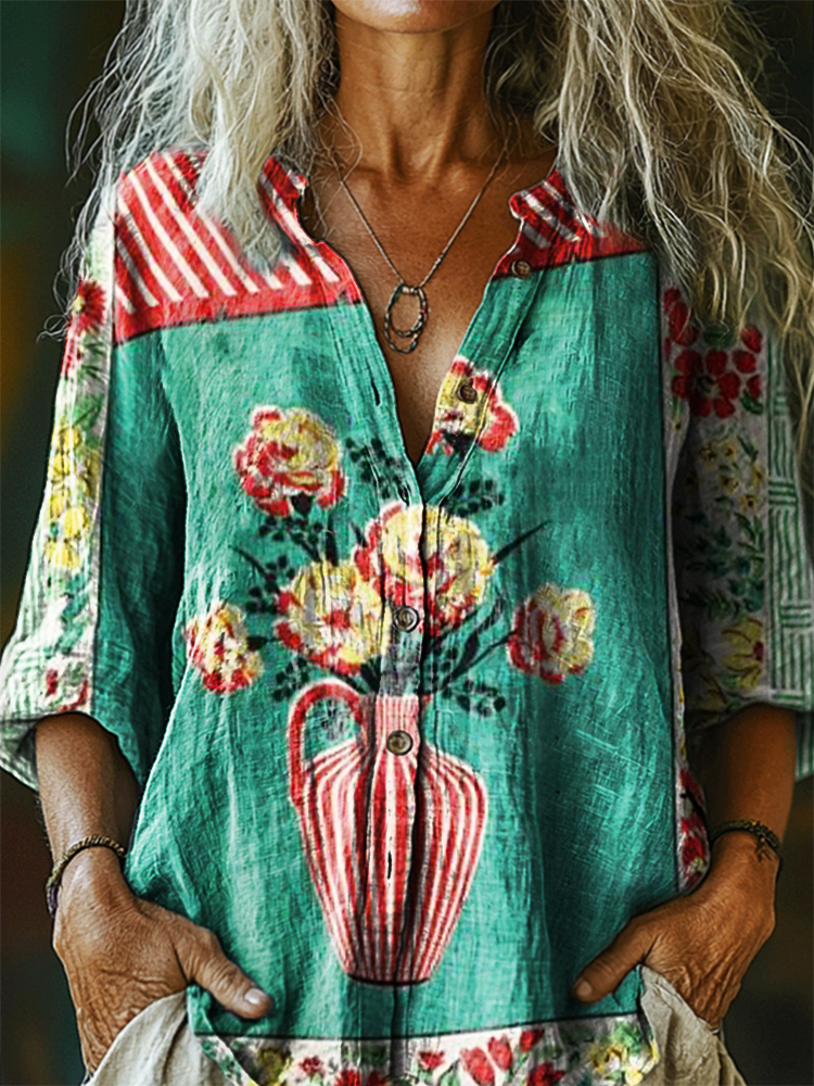 Women's Vintage Floral Art Print Casual Cotton Linen Shirt