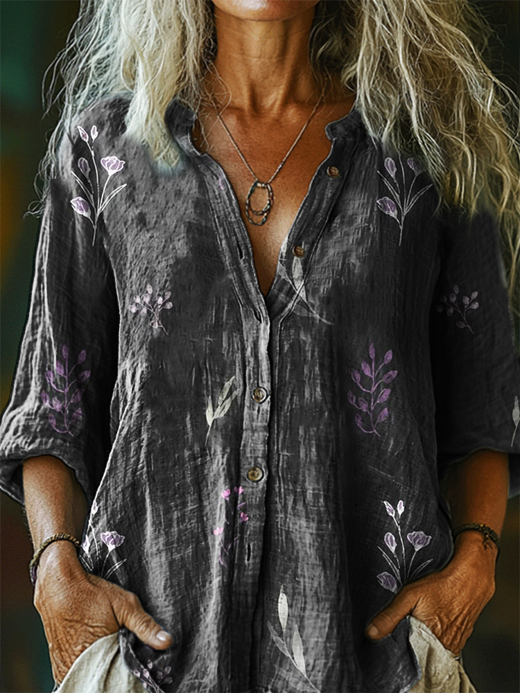 Women's Vintage Floral Art Print Casual Cotton Linen Shirt