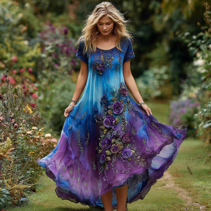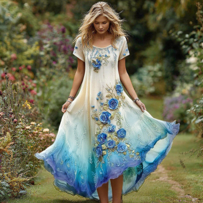 Women's Vintage Floral Embroidery Gradient Pattern Round Neck Dress
