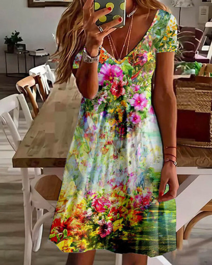 Casual V-neck Floral Print Short-sleeved Dress