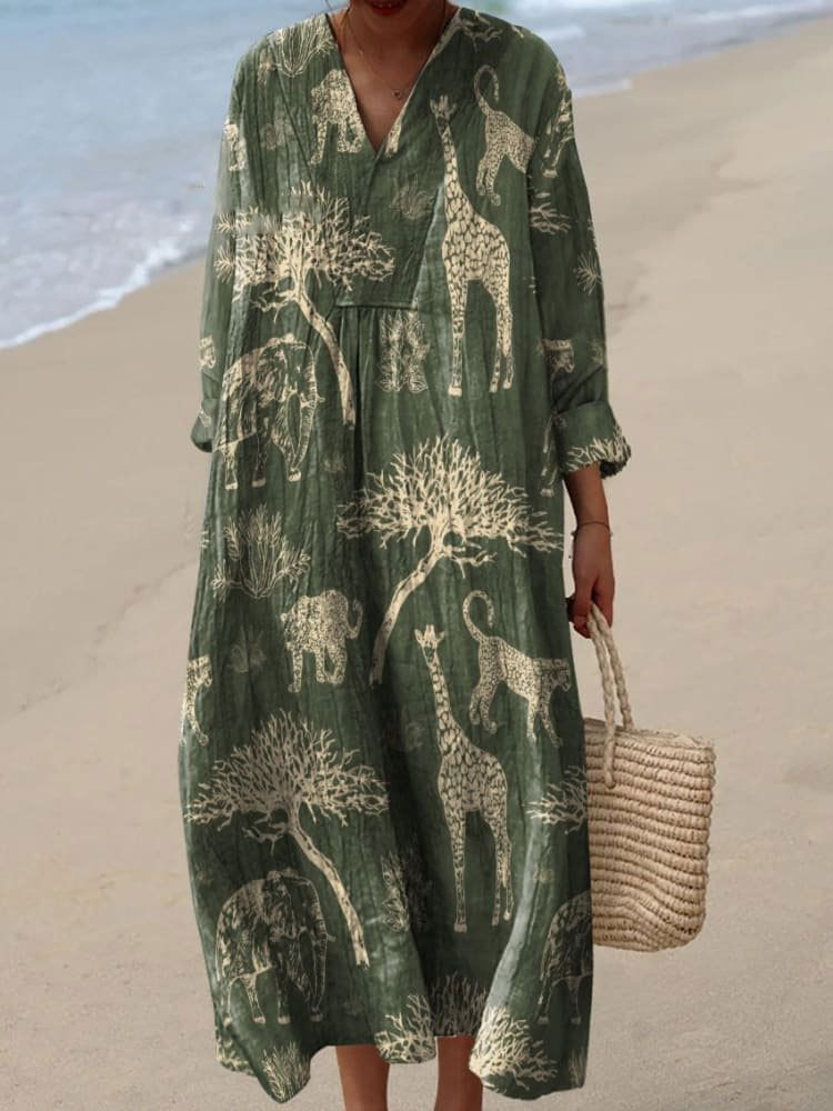 Decorative Pattern with Trees and African Wild Animals Flowy Dress