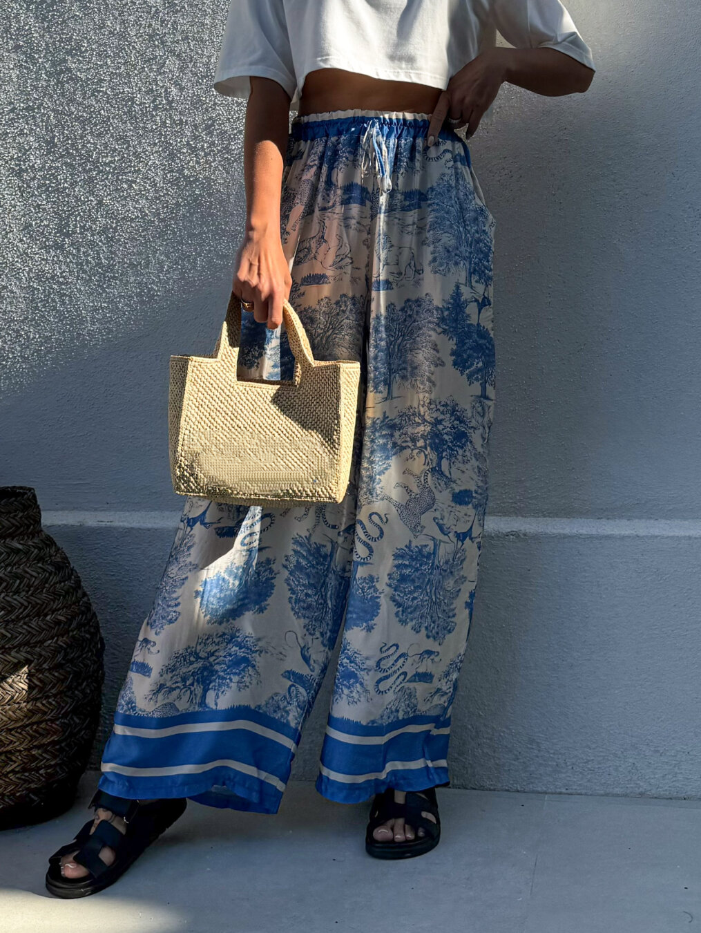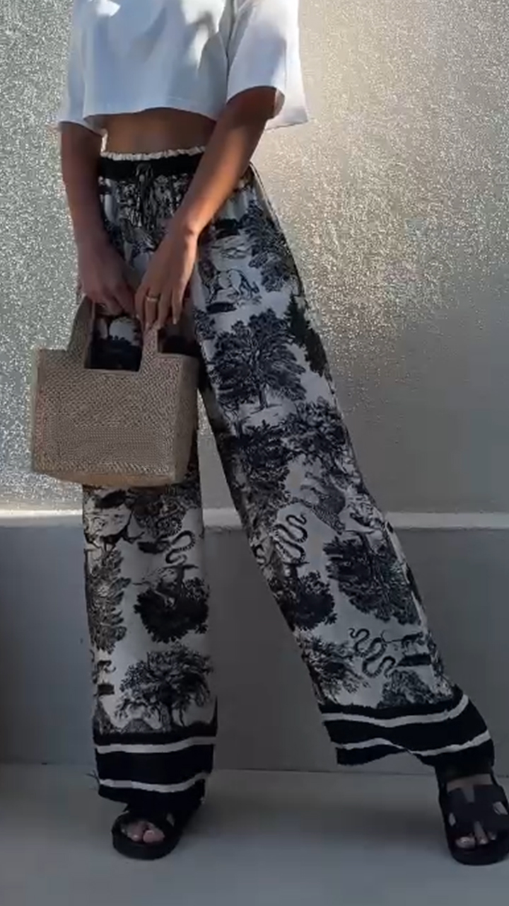 These printed wide - leg pants are a styling gem. Pair them with a cropped white tee and woven tote (like in the picture!) for a cohesive, bohemian - chic look that’s perfect for a summer day or a casual brunch. Dress them up with a silk blouse and espadrilles for a more polished appearance at a dinner date or a coastal event. You can also layer them with a denim jacket and ankle boots for cooler weather, or wear them with a bikini top as a trendy cover - up for beach days.