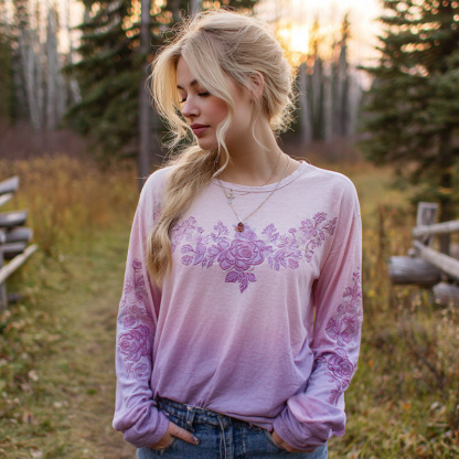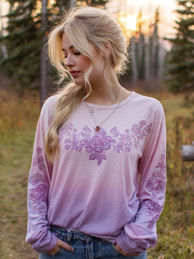 Women's Casual Gradient Purple And Pink Floral Embroidered Linen Long Sleeve T-shirt