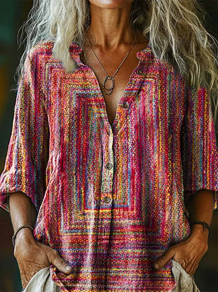 Women's Colorful Line Texture Art Pattern Print Casual Cotton Linen Shirt
