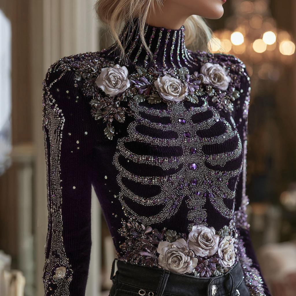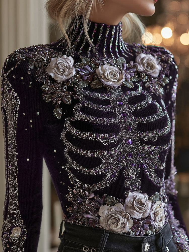 Women's Halloween Bloody Floral & Skeleton Art Turtleneck Slim Sweater