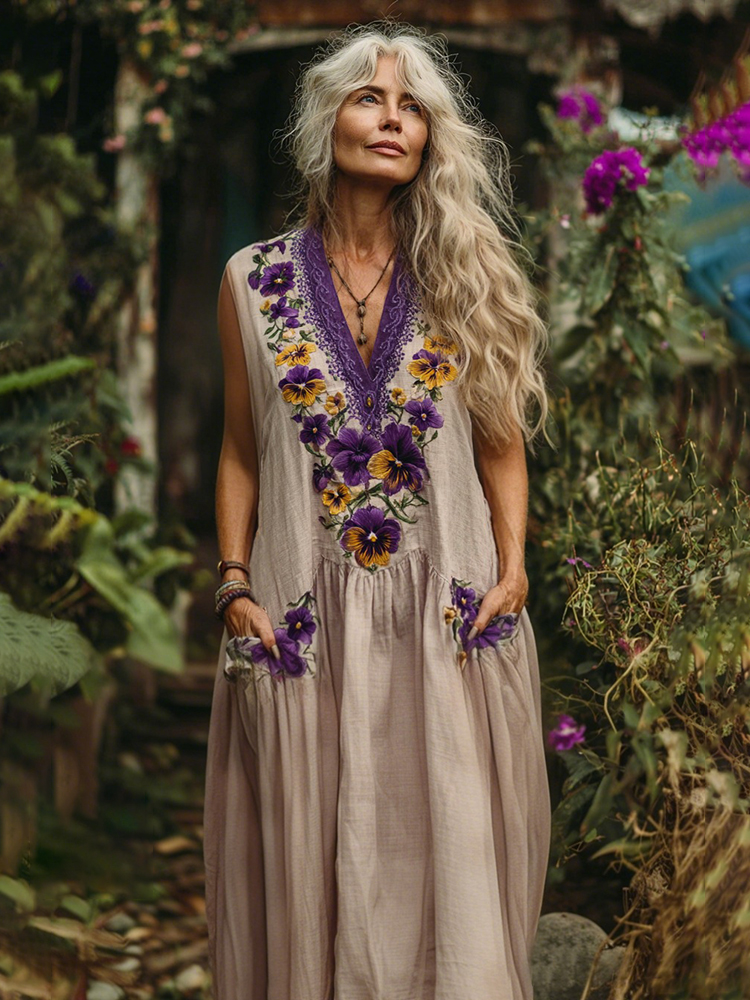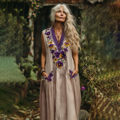 Women's Pansy Embroidery Design Linen Maxi Pocket Tank Dress
