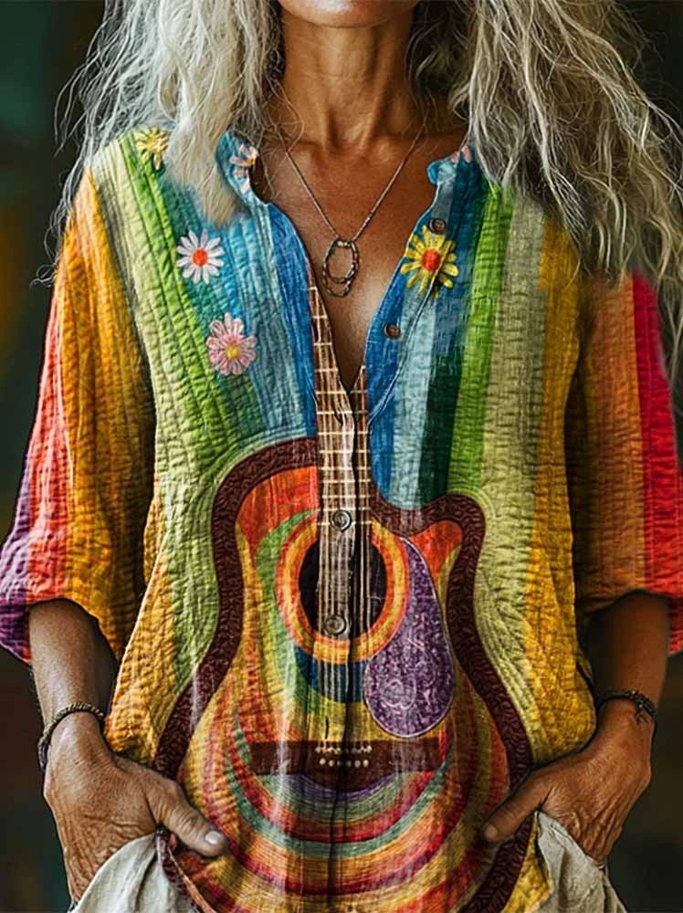 Women's Rainbow Guitar Art Print Casual Cotton Linen Shirt
