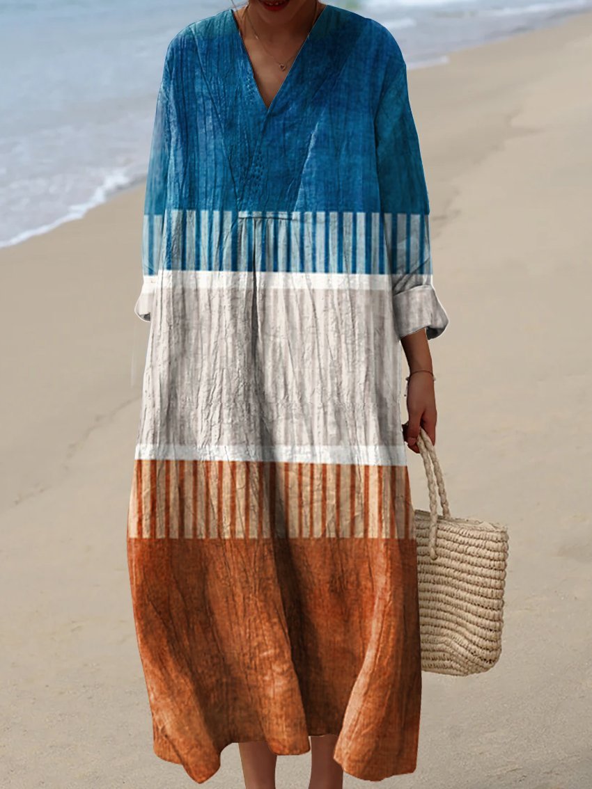 Women's Three-color Color-block Abstract Geometric Stripes Watercolor Splash Fluid Art Print Flowy Dress
