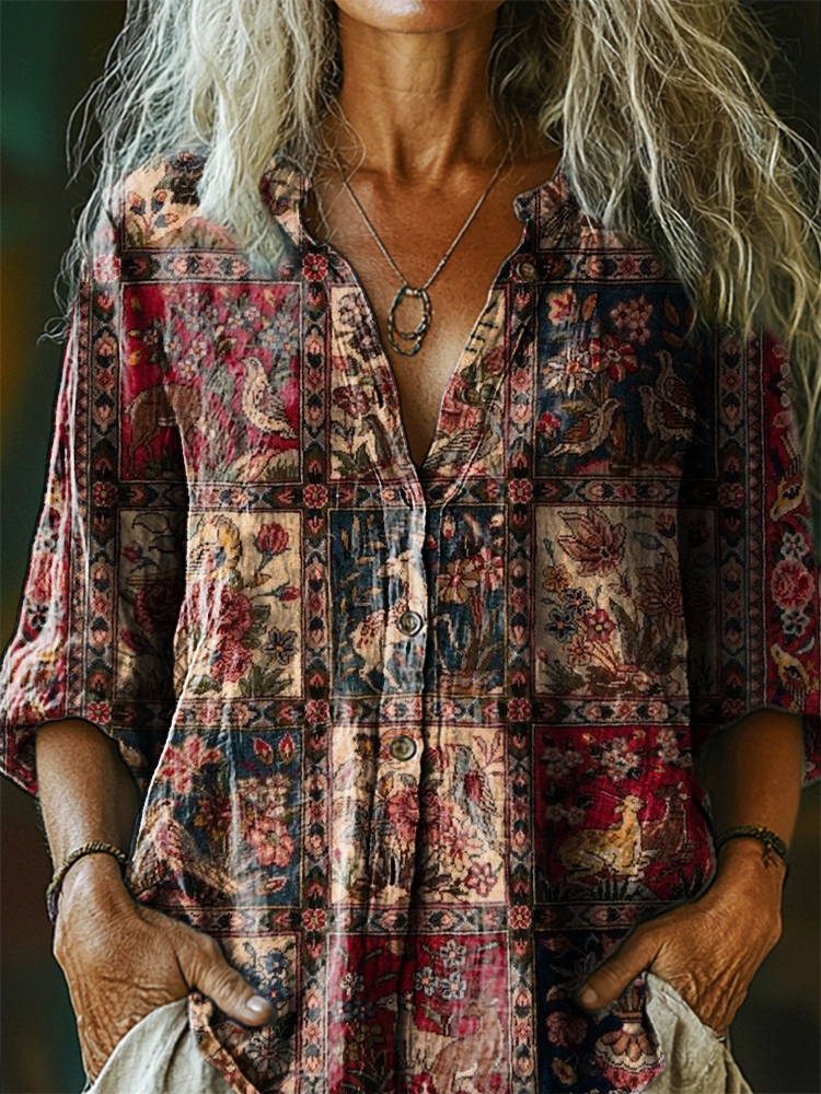 Women's Vintage Ethnic Floral Art Print Casual Cotton Linen Shirt