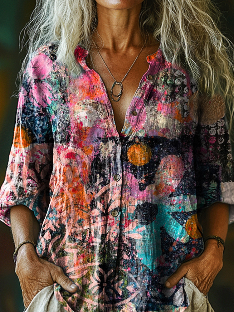 Women's Vintage Floral Art Print Casual Cotton Linen Shirt