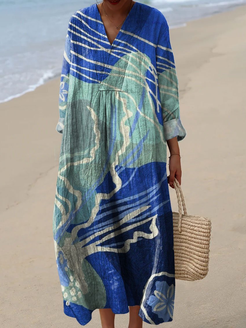 Women's Vintage Hand Drawn Blue Ocean Jellyfish Art Print Flowy Dress