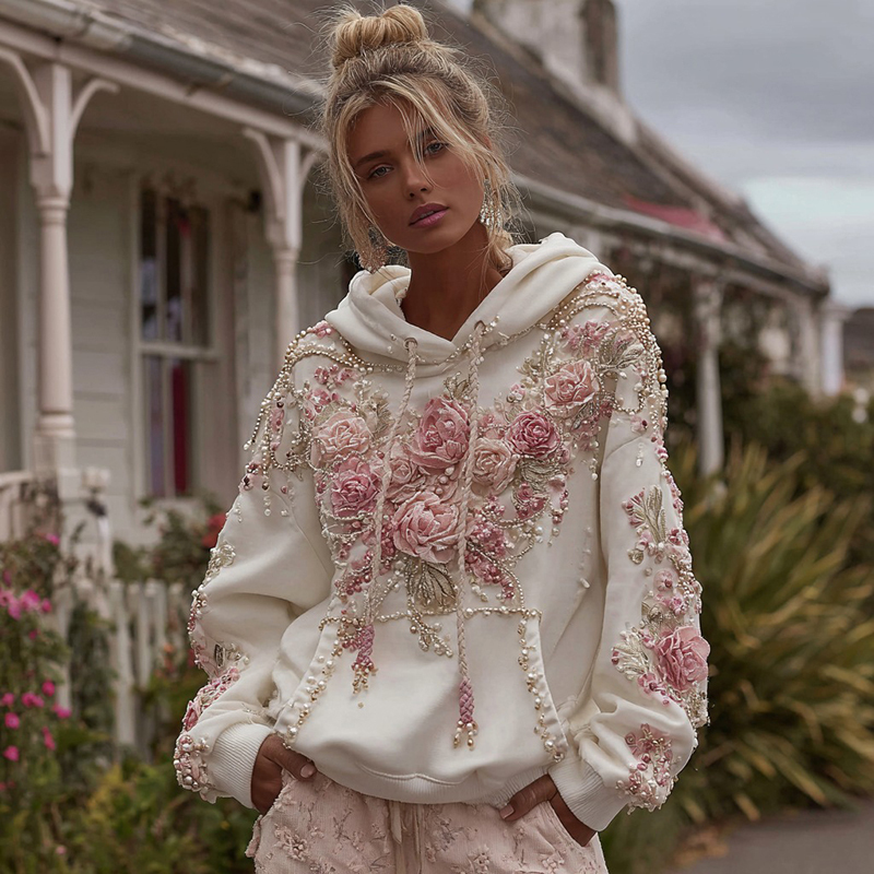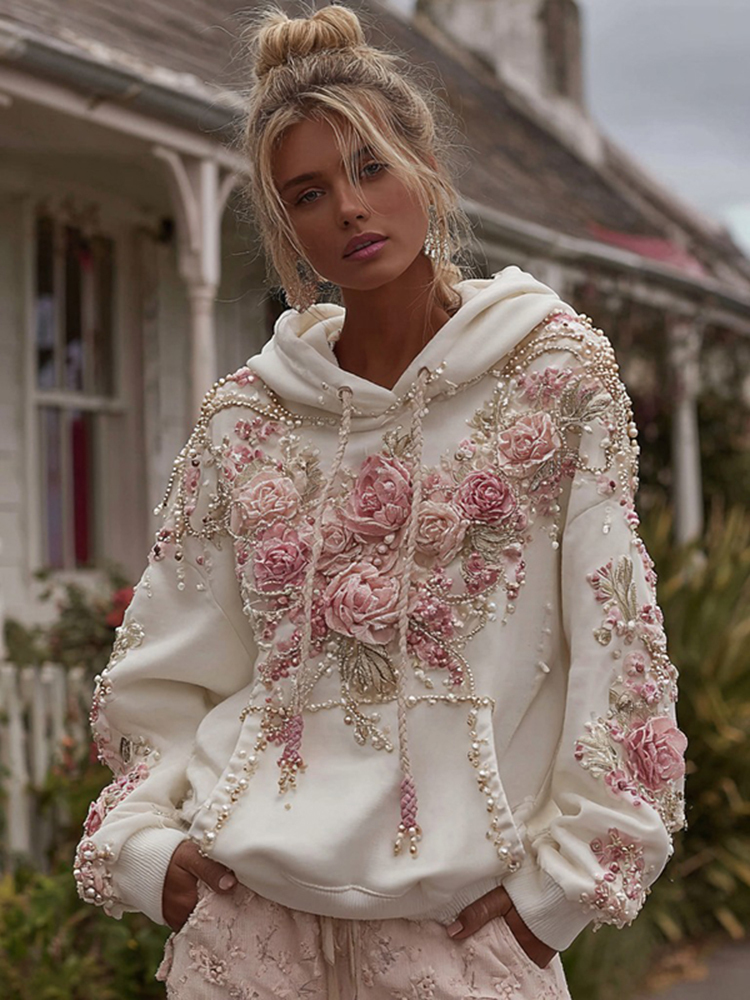 Women's Vintage Rose Pearl Embroidery Comfortable Warm Hoodie