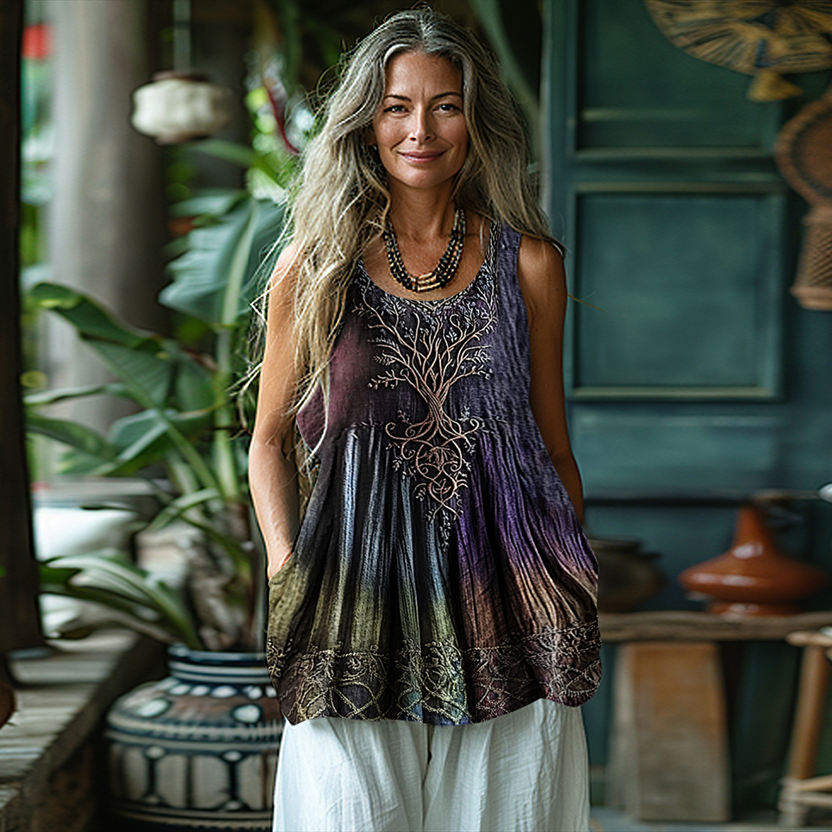 Women's Vintage Viking Tree Of Life Gradient Art Linen Tank Top