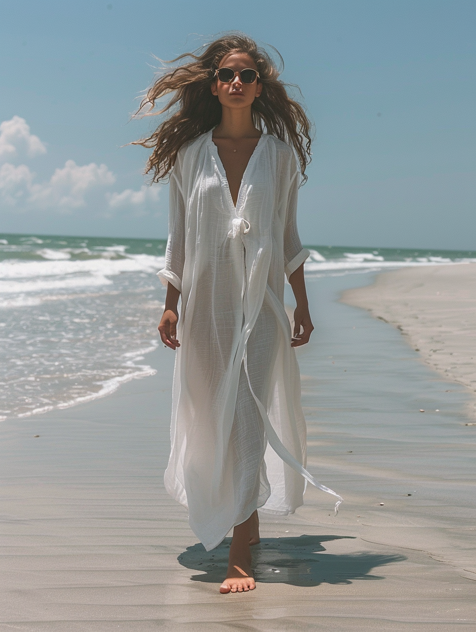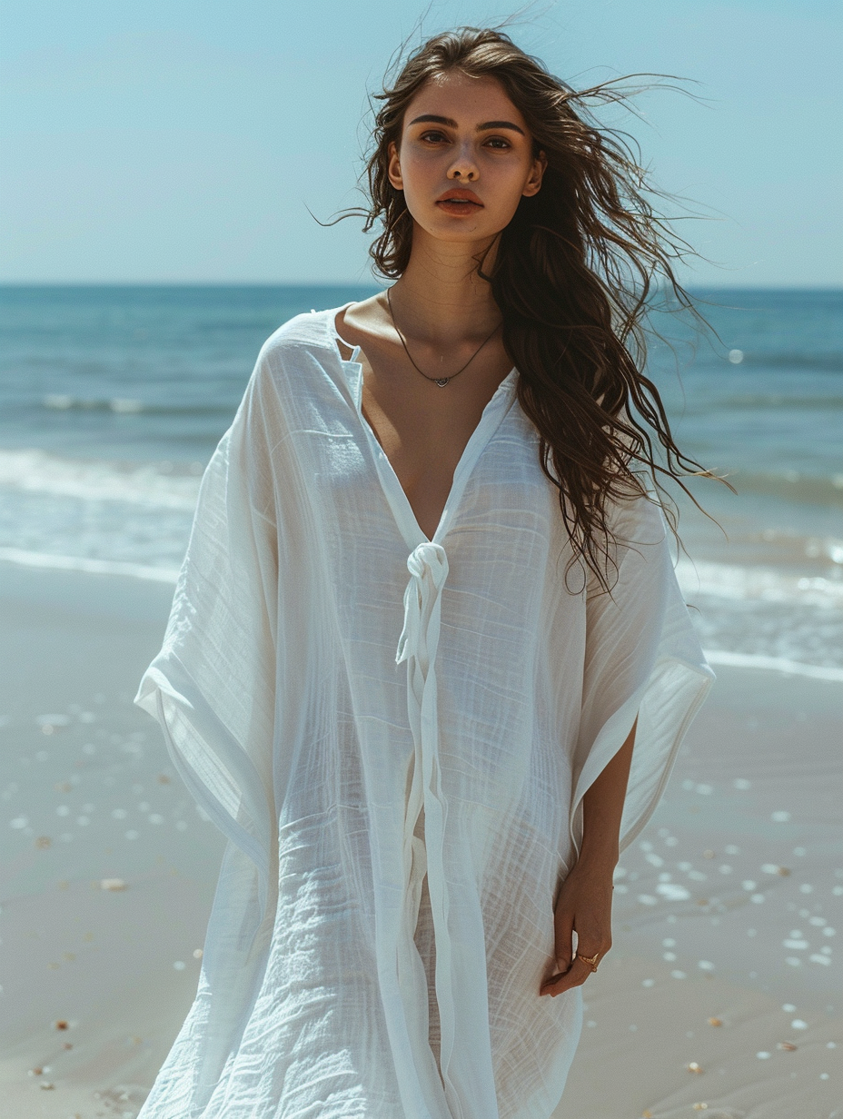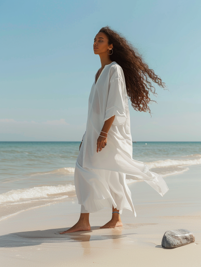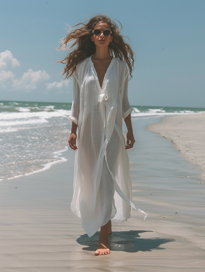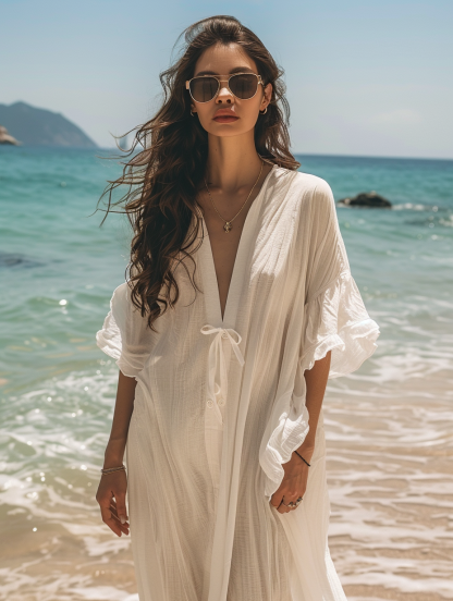 Caftan Kimono Solid White Color Beach V-Neck Kaftan Dress