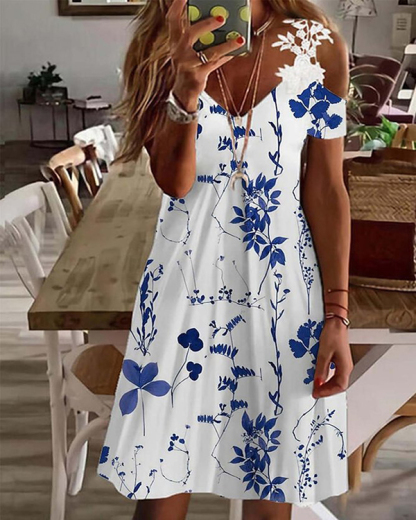 Lace Panel Off Shoulder Floral Short Sleeve Dress