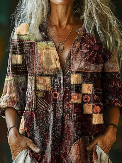 Vintage Patchwork Art Print Casual Cotton Linen Shirt