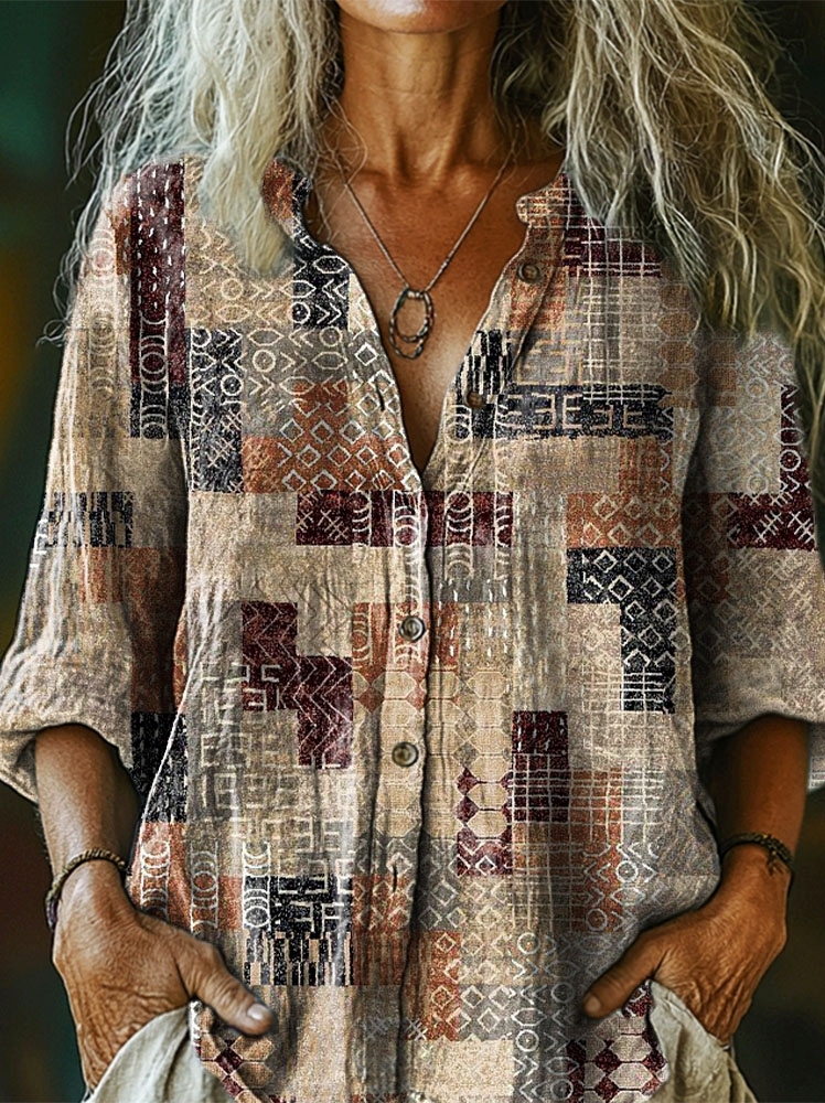 Women's Bohemian Patchwork Art Pattern Print Casual Cotton Linen Shirt