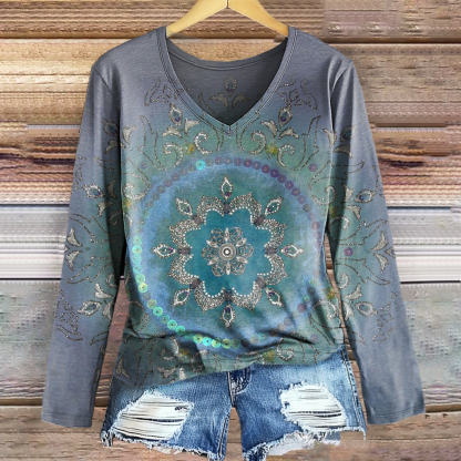 Women's Vintage Ethnic Floral Art Print Casual V-neck Long Sleeve T-shirt